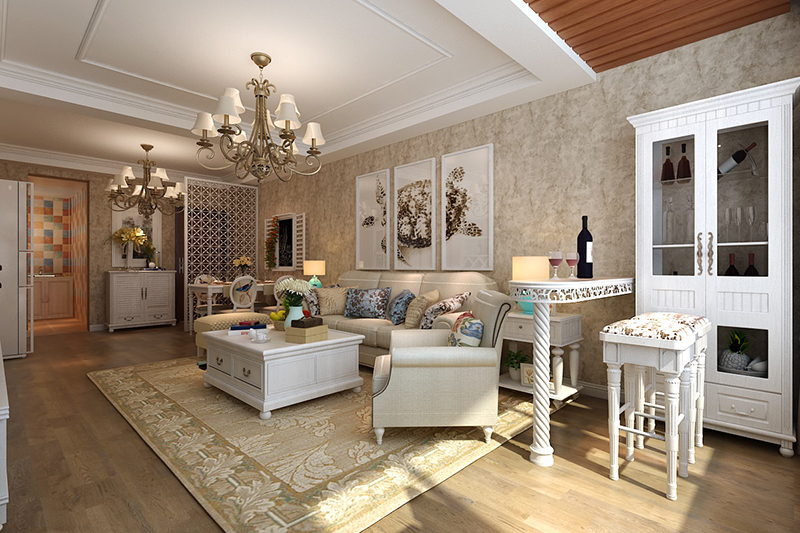 設想理念:本案界說為美式氣概,美式氣概對復古古樸的工具比擬偏心,天然、復古、披發著樸素氣味的色采是首選,美式氣概搭配經常用仿古藝術品停止特顯文明藝術氣味,被翻卷邊的古舊冊本,植物的金屬雕像等等,這些工具搭配起來顯現出艱深的文明藝術氣味。是以凈水磚墻最能代表美式氣概,其古樸天然的色采質感廣受愛好,家具色采還應當與空中資料相調和,能夠在室內部分加鋪地毯,以和緩冷硬的感受。