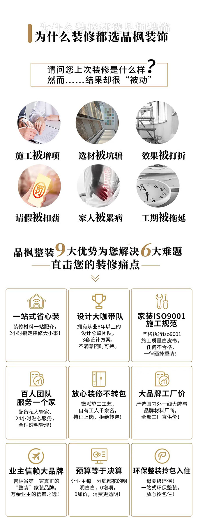 晶楓裝飾在大連市顛末4年的發展,埋頭苦干于僵持和簡化束裝主要形式。讓用戶在晶楓真實休會到“省時、省功、勞神、節約成本”,不是要東奔西跑選用料,一趟式做事,讓家庭裝修像購買化妝品一種簡潔便利店!
